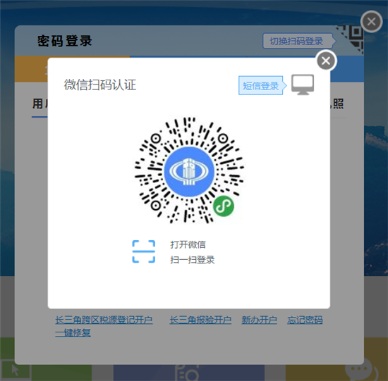 (4)用户除了选择短信验证之外,还可以选择微信扫码登录验证方式。在手机短信登录验证界面的右上角,点击二维码标识切换至扫码验证界面。