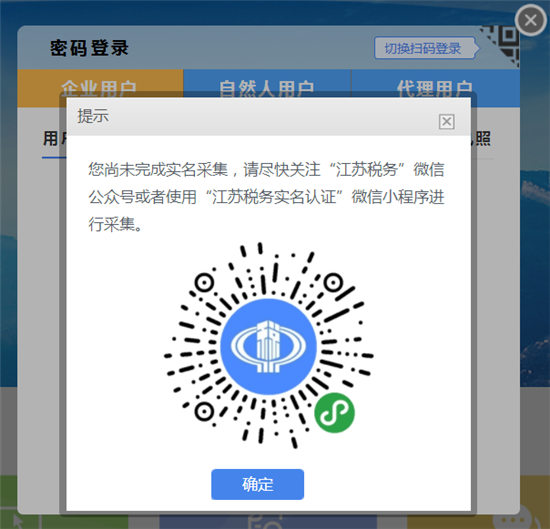 注意:上述两种验证方式均针对已经办理实名采集的办税员,如果还未进行实名采集,在身份和人员选择后,会对所选择的办税人员进行实名校验,跳出弹框提示当前办税员进行实名采集。