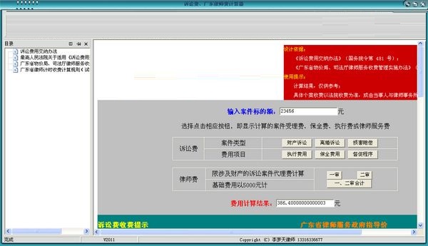1、法院诉讼费计算器绿色版适用于标的明确的财产案件的诉讼费用,以及广东省律师费计算。