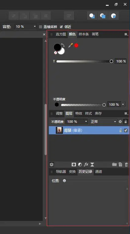 在这里的右边交叉,我们有各种各样的面板,它们分享诸如图层控制之类的功能、历史、变换、直方图以及各种颜色选项。