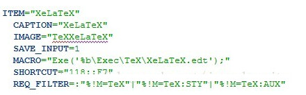 方法:在菜单中选择options —> option interface —> Menus and Toolbar,打开Main Menu文件,找到XeLaTeX所在的位置,在MACRO后面以行添加SHORTCUT,如下图所示: