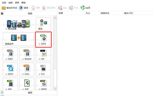 第二步,选择要转成的格式。该软件支持多种格式转换,首先选择“视频”区,然后选择要转换成的格式,这里以MP4为例