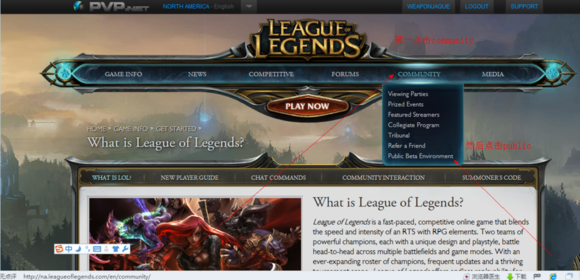 ①打开英雄联盟美服官网http://gameinfo.na.leagueoflegends.com按截图打开网址对应的指令