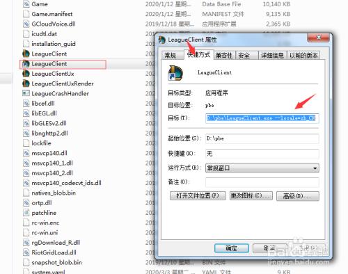 第二步:右键点击LeagueClient快捷方式,点击属性,再点击快捷方式,在目标后面加上 –locale=zh_CN(注:前面有个空格),然后再点击确定。