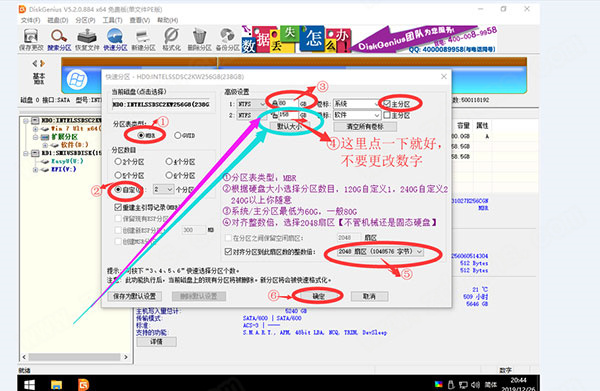 一分区:最低60 分区数:看硬盘大小,自己取舍! 分区表:Win7选MBR Win10选gpt! 其它默认!