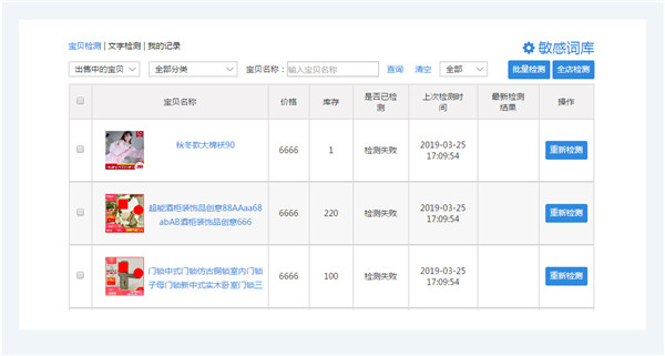 可以单个宝贝、多个宝贝、全店检测商品,高效自检,避免违反广告法;同时支持词库添加自主关键词。