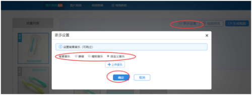 按照制作场景1的办法,此次类推继续往下制作。制作全部完成后,点击右上角更多设置里选择音乐。支持自定义MP3格式的音乐文件上传替换模板里的原音乐。