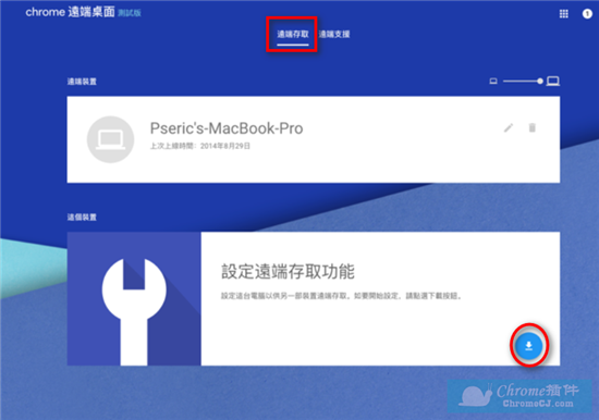 3、接着点选「开始使用」后会看到Chrome远程桌面的两项功能:远程存取、远程支援,前者主要是通过Google帐户连线到你的其他装置,后者是开放让其他人可连接到这台电脑进行远程操作等功能。第一次使用先点选「设定远端存取功能」右下角的下载按钮安装程序。
