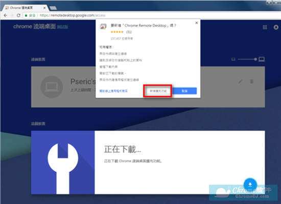 4、跳出是否要安装Chrome Remote Desktop扩展功能的提示画面,点选「新增扩充功能」将它下载到浏览器。