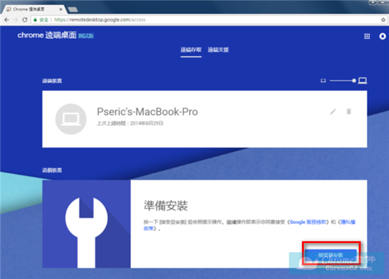 5、下载后会显示「准备安装」,再次点选「接受并安装」同意Google服务条款及隐私权政策就能将远程桌面工具安装到浏览器中。