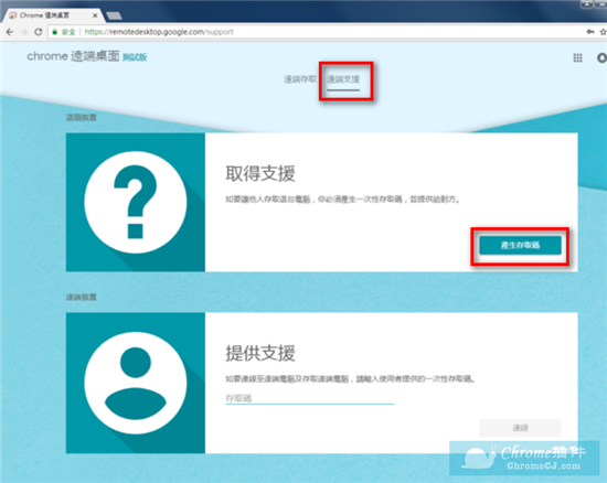 1、从Chrome远端桌面上方的选单点选「远端支援」切换到另一功能,在这里有两个选项,分别是用于取得支援的「产生存取码」,以及可连线到其他远端电脑的输入存取码栏位。
