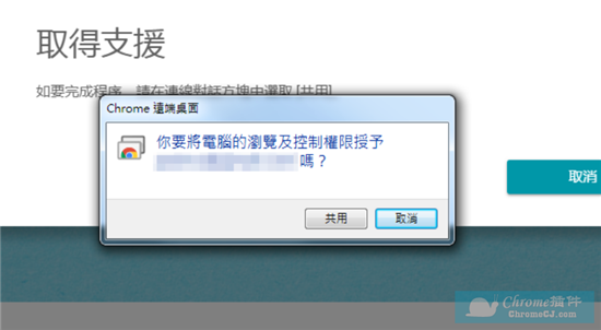 4、这时候原电脑会跳出Chrome远端桌面的提示讯息,询问使用者是否要将电脑的浏览及控制权限给远端登入者(后面会显示对方的Google帐号),点选「共用」授权。
