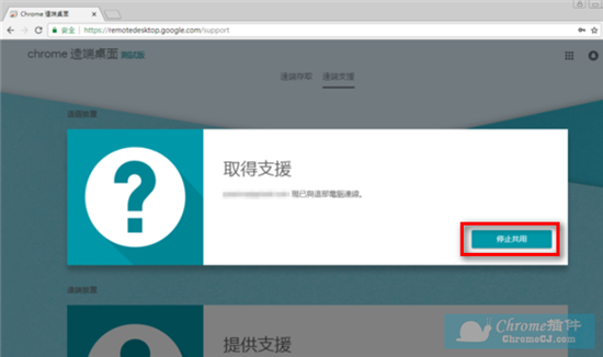 5、当远端连线者成功连到你的电脑,在取得支援下方会显示对方的Google 帐号,也可以随时停止共用将对方剔除。
