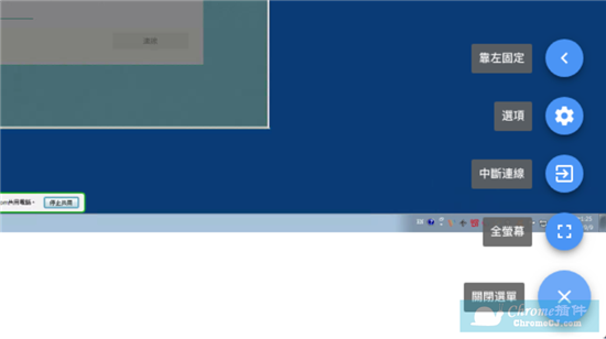 6、开始连线后就可以通过浏览器画面操控远端电脑,Chrome 远端桌面的选单和设定选项则是在右下角,若想在连线时于本机和远端电脑互相复制贴上内容,连线者也必须安装Chrome 远程桌面工具。