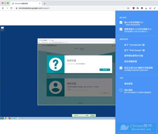 8、预设情况下会让Chrome 远端桌面缩小以符合视窗大小,同时会调整桌面大小让使用者可直接于浏览器中操作,如果不符合使用习惯都是可以从选项里变更的。除此之外,因为远程桌面有时候无法传送键盘组合键,在Chrome 远端桌面的选项中也有按下不同组合键的快速控制选项。