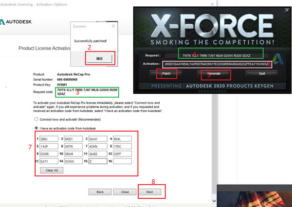 16、第一步一定要先点击patch,弹出“successfully patched”才能进行下一步,然后开始将软件中的request code中的内容复制到注册机中,点击generate将会出现activation激活码,复制到软件中,点击“next”;如下图所示。