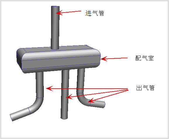 此几何模型包含一个进气管、三个出气管和一个配气室: