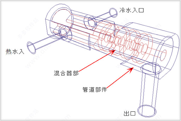 CAD 模型由两个固体部件构成。我们将使用CFD几何工具来创建模拟水流的内部部件。 管道和混合隔板为铜质。