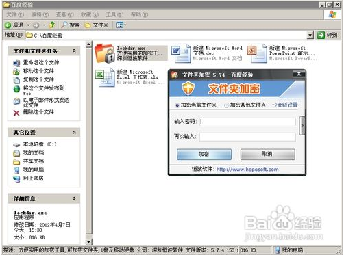 设定好密码点击[加密]按钮,马上就能看到所有文件消失了,这时如果在此双击运行该软件,看到的就是输入密码来解密的界面。(在“文件夹选项中”设置了“不显示隐藏的文件和文件夹”的朋友们是看不到另外两个图标的)