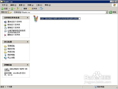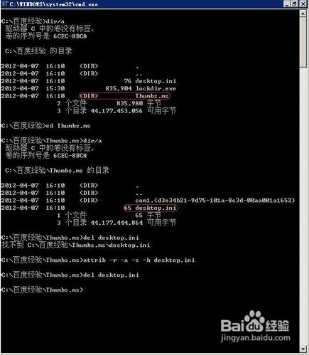 既然在资源管理器里找不到藏起来的文件,就让我们到命令行里想办法吧。我们看到Thumbs.ms原来是个文件夹,进入后又看到desktop.ini文件,就是它把Thumbs.ms文件夹伪装成了这样(小知识:把desktop.ini设定为系统属性放到文件夹里,这个文件夹就会根据desktop.ini文件的内容变成指定的样子,详见其他资料)。那我们删除它试试,怎么会找不到这个文件呢?原来它被设置成了隐藏属性,当然找不到它了。用attrib命令清除它的只读、存档、系统、隐藏属性,终于把它删除了。回到资源管理器,可以看到Thumbs.ms恢复了文件夹的样子,也可以进入了。