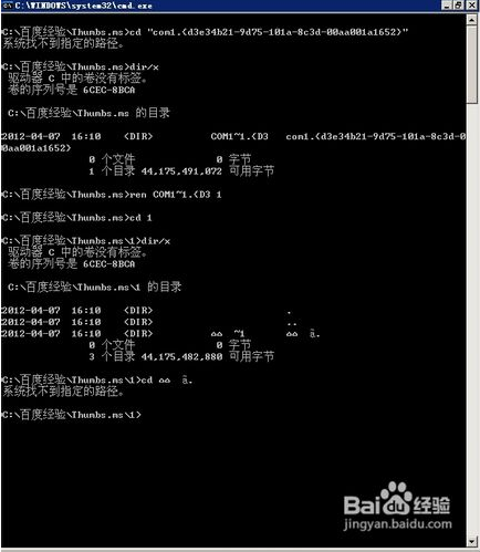 我们回到命令行下,却发现连这个文件夹都进不去,为什么呢?原来问题在于文件夹的名称(除去扩展名)是“COM1”,这个特殊名字是不可以作为文件名使用的,那么我们该怎么办呢?原来文件名可不止一个哦,我们使用“dir/x”命令可以看到它的8dot3文件名(又称短文件名),照着输入就可以了,为了方便后面的操作,我们干脆把它改成最普通的文件名。可是后面这个文件夹怎么还是进不去呢?
