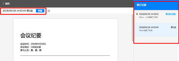 现在,你可以将一篇文档分享给相关人员,一起修改。在此过程中,修改的内容会同步显示在屏幕上,并标记出人员名字,防止错乱。大家还可以使用「查看修订记录」的功能,随时回滚历史文档并保存。
