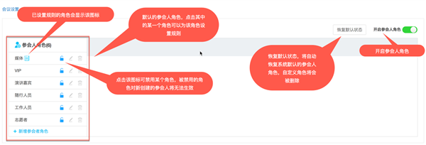 如果您的会议在之前已经创建好,但是又想使用系统内置的6个默认角色,可以使用“恢复默认状态”按钮,点击该按钮后,系统将为您自动创建这6种默认角色。