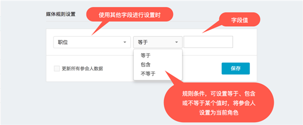 目前参会人角色仅支持使用一个字段规则进行判断某个参会人是否属于某种角色,您可以选择参会人表单中的任何一个字段来进行判断某个参会人是否属于某种角色,同时我们也分享了使用通道做为判断参会人角色规则的功能。