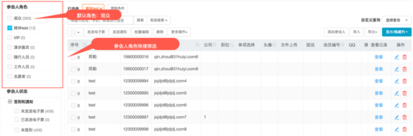 当角色功能启用后,任何通过报名、后台添加、导入的参会人,只要满足条件都将会被自动匹配角色,并能够通过左侧快捷筛选功能进行筛选。