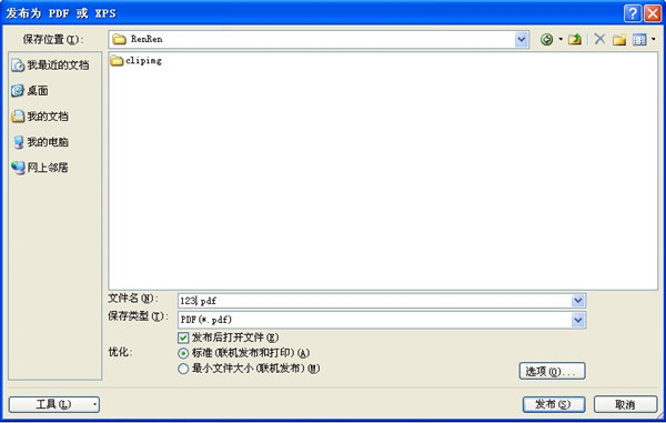 2.点击上图“Pdf或xps(P)”之后,就有弹出下图提示框,填写你的名称及选择相应位置和选项就可以了。