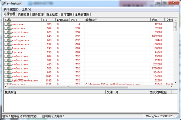 2:关于Wsyscheck启动后状态栏的提示“警告!程序驱动未加载成功,一些功能无法完成。”