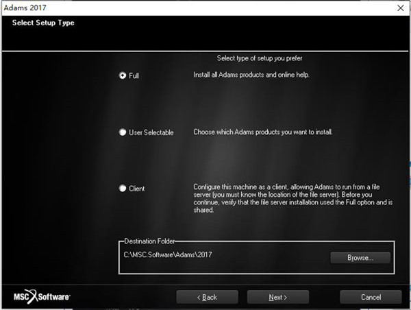 17、点击【Browse.】更改软件安装路径:建议安装到除C盘以外的磁盘,可在D盘或其它盘里面新建一个文件夹【adams】,点击【Next】