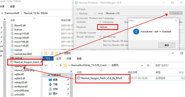 7、先将注册机文件夹中的文件复制到安装目录下,管理员身份运行,选择SQLite,然后点击patch按钮,提示navicat. exe -x64-> Cracked!点击确定