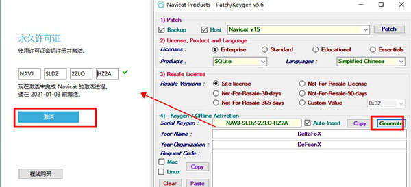 9、点击generate生成按钮,将生成的注册序列号复制到窗口中,点击激活,如图所示