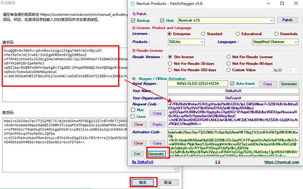 11、将软件中的申请码复制到注册机如下位置,点击下方的generate生成新的激活码,激活码生成并自动填充到软件中,点击下方的激活按钮,激活成功,点击确定