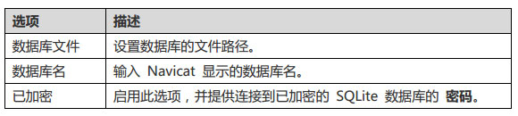 如果用户使用 Navicat for SQLite 服务器对象,应该先创建并打开一个连接。可以附加数据库,在已打开的连接上右击并选择“附加数据库”,输入下面的信息。