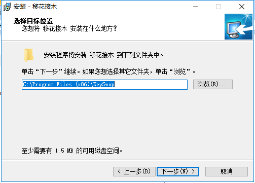 2、选择keyswap移花接木安装位置,您可以点击【下一步】,软件会默认安装,或者您可以点击【浏览】在打开的安装选择窗口中您可以自行选择软件的安装位置,选择完成后点击【下一步】继续安装。