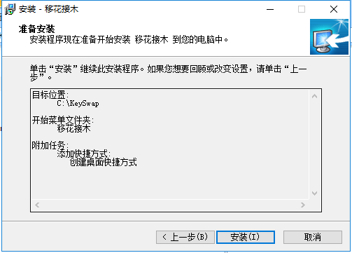 5、准备安装keyswap移花接木,您可以先检查软件的安装位置是否正确,如果正确点击【安装】,如果有误点击【上一步】进行修改,修改完成后点击【安装】。软件安装速度很快。