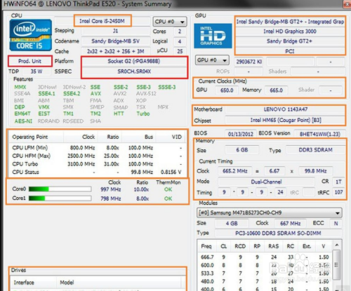 橙色的框中,左侧从上往下依次是CPU名称、CPU频率的设定值、CPU各个实际核心的频率、硬盘和光驱的参数;右侧从上往下依次是显示芯片的参数、主板的型号和芯片组的型号、内存的相关信息、操作系统信息。