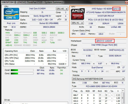 主界面也可以看到CPU、内存、显卡、硬盘和光驱、声音设备、网卡、电池等信息。