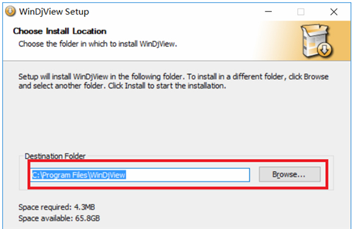 3、然后为djvu阅读器选择安装位置(choose install location),你可以点击“browse”【浏览】自定义一个安装路径,因为阅读器默认是安装在C盘的,小编不建议大家选择默认安装哦。