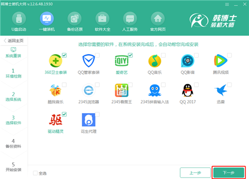 第三步:系统选择完毕后,我们可以根据自己的需求,自定义勾选想要安装的软件,选择完成后,程序会自动帮你安装这些软件到新的操作系统;
