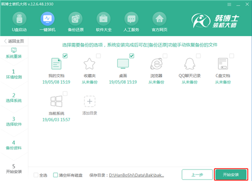 第四步:在系统重装之前一定要备份好重要文件,根据需要勾选项目进行备份,然后点击“开始安装”。