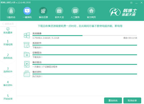 第六步:下载完成后重启电脑,默认会进入韩博士pe重装系统,接下来只需等待系统安装完成就可以了。