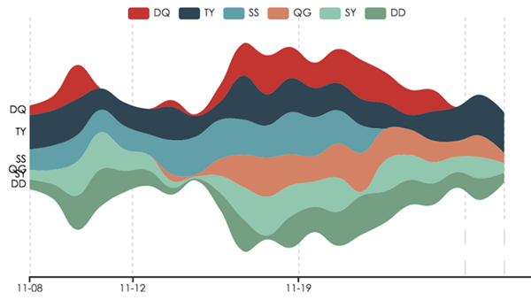 主题河流图是一种特殊的流图,它主要用来表示事件或主题等在一段时间内的变化。主题河流中不同颜色的条带状河流分支编码了不同的事件或主题,河流分支的宽度编码了原数据集中的value值。此外,原数据集中的时间属性,映射到单个时间轴上