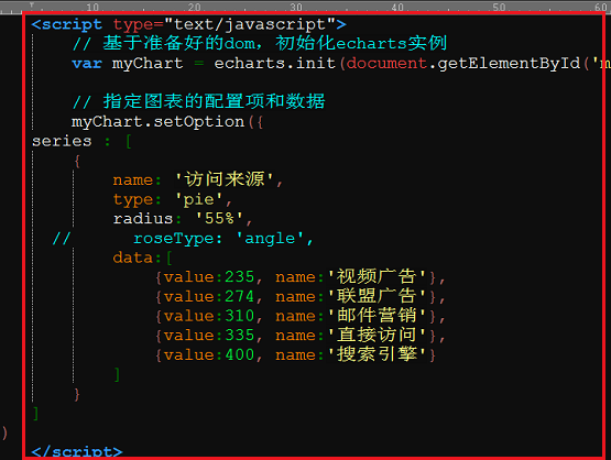 4.我们下面来绘制饼图,同样也是先初始化echarts实例,指定图表配置项和数据,如下图所示