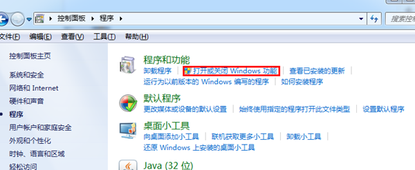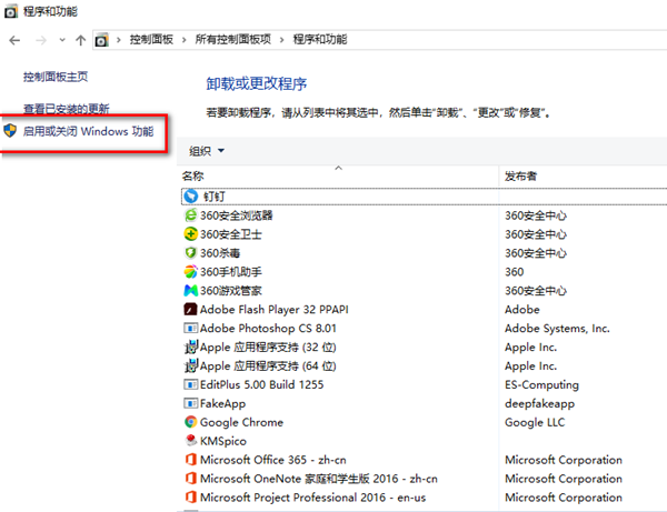 3.进入“程序与功能”面板后,我们在左侧再找到“打开或关闭Windows功能”,并点击进入