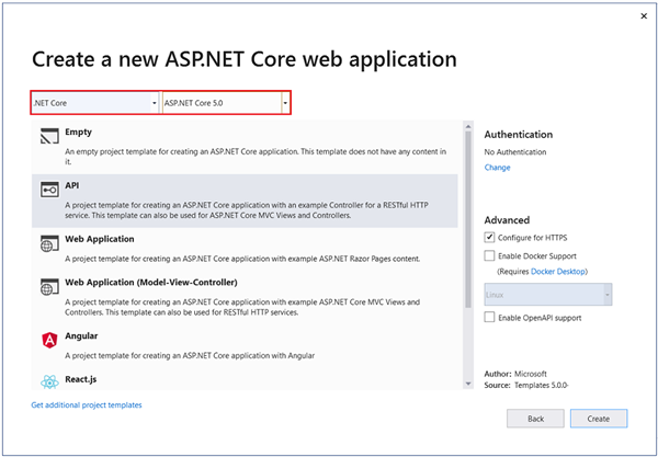 在“创建新的 ASP.NET Core Web 应用程序”对话框中,确认选择 .NET Core 和 ASP.NET Core 5.0 。 选择“API”模板,然后单击“创建” 。