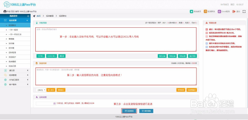 点击【短信群发】进入群发模式页面,分别输入目标手机号码、短信内容即可,确认内容格式无误之后点击发送按钮。