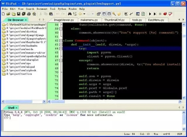 Ulipad是面向程序员的灵活编辑器。它具有许多功能,例如类浏览器,代码自动完成,html查看器,目录浏览器,向导等。最有趣和独特的功能是使用混合技术,这使Ulipad成为易于扩展的编程环境。您可以编写自己的mixin,插件或简单脚本,并且可以将它们全部无缝集成到Ulipad中。